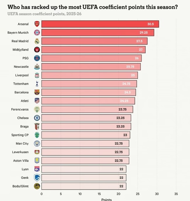 TA欧战积分榜:阿森纳30.5分领跑欧洲 拜仁&皇马紧随