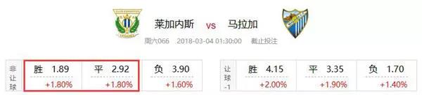 本场比赛平均初盘开出1.88 3.54 4.23,受注后暂时调整为2.12 3.00 3.96,亚盘则普遍由初盘的主让半球降盘至主让平手/半球,初盘盘口明显过深,降盘后更符合两队的实力状态。莱加内斯多轮不胜的情况对上盘有一定的阻力,不过综合人员等方面的因素考虑,马拉加很难在对手身上占到便宜,本场看好主场作战的莱加内斯至少不败。
