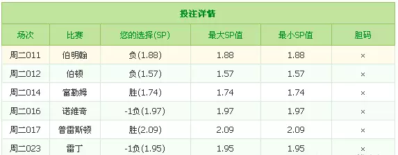 周二011负+周二012负+周二014胜+周二016让球负+周二017胜+周二023让球负