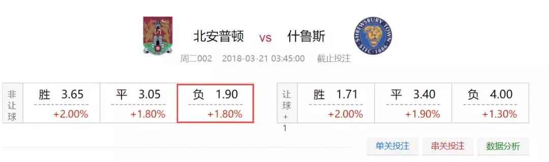 亚指初盘开出客让平半盘中水,后市已经来到半球高水,升盘升水有阻上的嫌疑,以两队目前在积分榜上的排名来看,什鲁斯客场全取三分问题不大,而北安普顿保级的战意也容易被放大,因此本场更为看好客胜能够打出,什鲁斯赢球升至榜首。