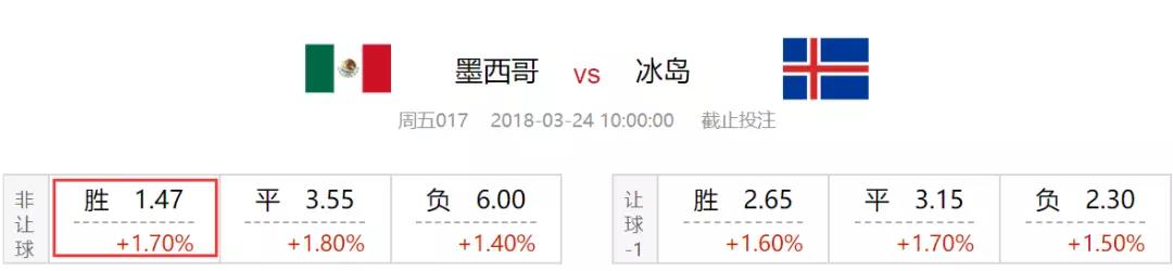 墨西哥近些年友谊赛的表现相当出色,最近18场友谊赛,墨西哥仅负于克罗地亚(12胜5平1负)。亚指目前给出半一中水,墨西哥热身赛状态不俗,再加上冰岛阵容太过“平民化”,半一让步还是在合理范围内,因此本场更看好墨西哥能够取得比赛的胜利,竞彩推荐主胜。
