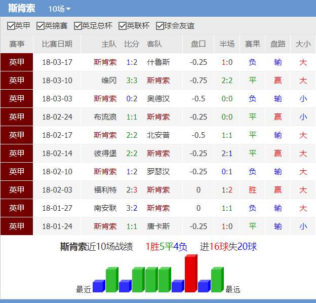 英甲中上游球队斯肯索普本赛季38轮过后积58分排名第5位于升级附加赛内,领先第7名5分,优势并不稳固,斯肯索普本赛季主场积分只占到总积分的47%,球队并不擅长主场作战。