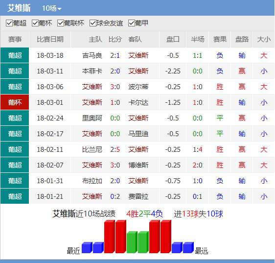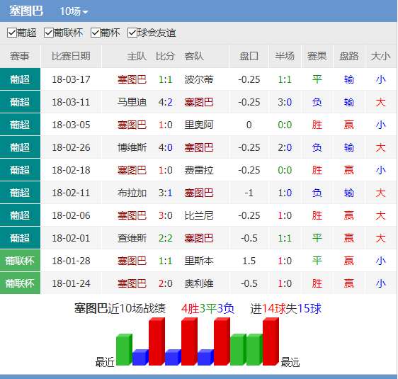 中游球队艾维斯联赛目前暂时排名第13,以净胜球优势领先本场对手塞图巴尔,本赛季首回合交手,艾维斯客场1-0击败塞图巴尔,各项赛事近4个主场3胜1平,期间全部零封对手防守不俗,上轮葡超1-2客场不敌第10的吉马良斯,遭遇联赛2连败。