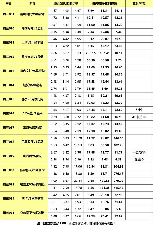 首页/ 赛事正文[关于离散] 是竞技彩票特有分析指数,指数基于百家欧赔即时赔率分歧度。基本原理是:百家欧赔平均值与每家赔率差值的绝对值的求和。离散度小则赔率公司观点接近,进而 彩果易打出,离散度大则反之意见分歧大,彩果不易打出。又因庄家操盘/变赔影响,离散低则概率高理论并非放之四海而皆准,需结合盘赔和基本面等信息综合运 用。简言之,离散是参考指标,而非填单依据!以下是各场数据汇总