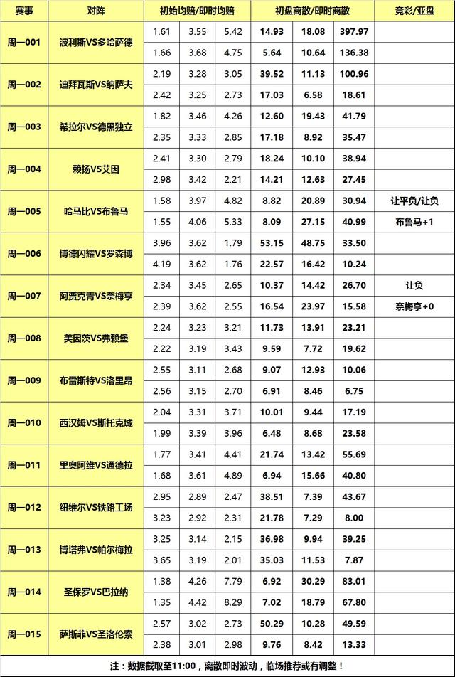 首页/ 赛事正文[关于离散] 是竞技彩票特有分析指数,指数基于百家欧赔即时赔率分歧度。基本原理是:百家欧赔平均值与每家赔率差值的绝对值的求和。离散度小则赔率公司观点接近,进而 彩果易打出,离散度大则反之意见分歧大,彩果不易打出。又因庄家操盘/变赔影响,离散低则概率高理论并非放之四海而皆准,需结合盘赔和基本面等信息综合运 用。简言之,离散是参考指标,而非填单依据!以下是各场数据汇总(数据截取至11:00):