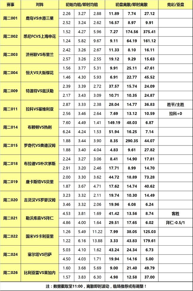 [关于离散] 是竞技彩票特有分析指数,指数基于百家欧赔即时赔率分歧度。基本原理是:百家欧赔平均值与每家赔率差值的绝对值的求和。离散度小则赔率公司观点接近,进而 彩果易打出,离散度大则反之意见分歧大,彩果不易打出。又因庄家操盘/变赔影响,离散低则概率高理论并非放之四海而皆准,需结合盘赔和基本面等信息综合运 用。简言之,离散是参考指标,而非填单依据!以下是各场数据汇总(数据截取至11:00):