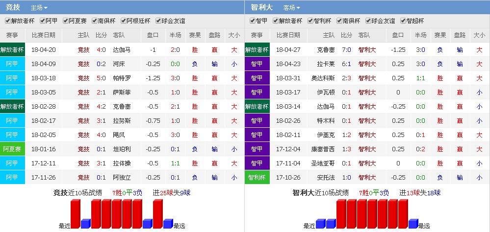 从双方上一次交战的情况来看,竞技虽然在盘面上占据了一定的优势,但是并美欧取得胜利,本场比赛自由杯的主场优势在盘面上体现出来,由于主队并非是高原主场,但是也转化了将近5个盘口的优势,且智利大学如果不是近期的两次崩盘演出,客场的人数指数不会太低,而这个强盘也是对于目前的客队糟糕状态的一种防范,因此主队大胜可期。