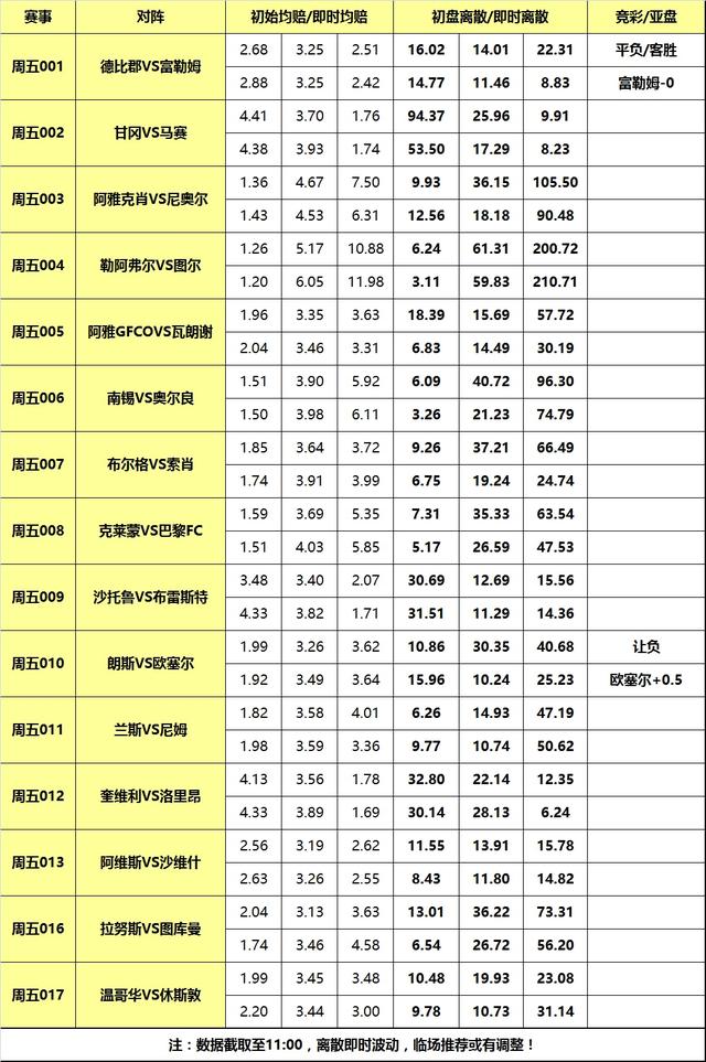 [关于离散] 是竞技彩票特有分析指数,指数基于百家欧赔即时赔率分歧度。基本原理是:百家欧赔平均值与每家赔率差值的绝对值的求和。离散度小则赔率公司观点接近,进而 彩果易打出,离散度大则反之意见分歧大,彩果不易打出。又因庄家操盘/变赔影响,离散低则概率高理论并非放之四海而皆准,需结合盘赔和基本面等信息综合运 用。简言之,离散是参考指标,而非填单依据!以下是各场数据汇总(数据截取至11:00):