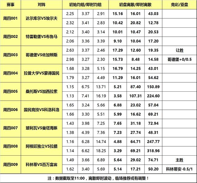 周四足坛赛事不多,欧洲区瑞典超继续3场争夺,美洲区赛场主打解放者杯赛事,小组赛最后一轮还剩6场比赛将全部进行,其中涉及国民竞技和拉普拉塔大学生等3场出线生死战,比赛相当值得关注。周四竞彩共计开售9场,早盘分享全部9场比赛即时指数,另附瑞典超和解放者杯2场比赛早盘解读。
