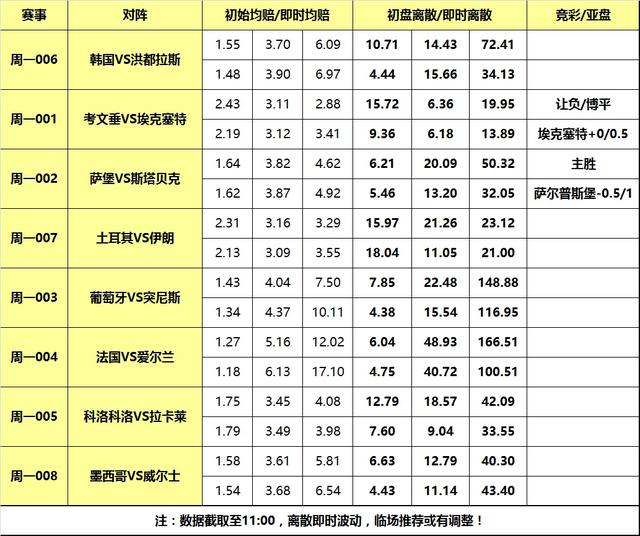 [关于离散] 是竞技彩票特有分析指数,指数基于百家欧赔即时赔率分歧度。基本原理是:百家欧赔平均值与每家赔率差值的绝对值的求和。离散度小则赔率公司观点接近,进而 彩果易打出,离散度大则反之意见分歧大,彩果不易打出。又因庄家操盘/变赔影响,离散低则概率高理论并非放之四海而皆准,需结合盘赔和基本面等信息综合运 用。简言之,离散是参考指标,而非填单依据!以下是各场数据汇总(数据截取至11:00):