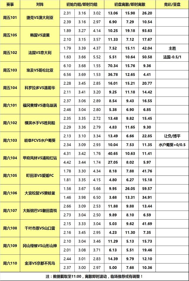 周五赛事依旧不多,今晚竞彩仅开售4场国家队友谊赛,以及美职1场;周六日职乙和日联杯继续进行,下午将一共进行11场日系赛事争夺。今日早盘分享周五竞彩5场,以及日系10场周六早场赛事指数,另附国家队友谊赛解读。