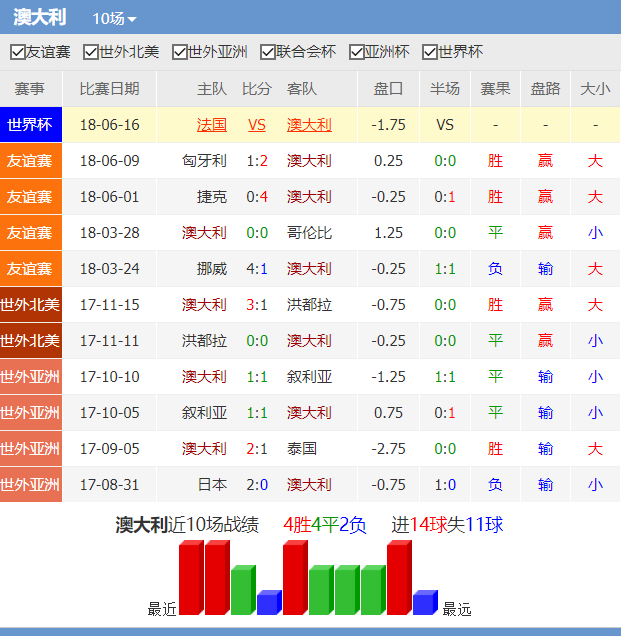 竞彩亚盘初盘直接开出法国让球半/两球高水的深盘,后势上盘水位始终维持在高位,澳大利亚世界杯历史对阵欧洲球队少溃败而且近期热身赛表现抢眼,高水有一定的阻力。小组赛因为双方实力差距较大,容易产生被血洗的情况。本场看发法国至少打入3球。
