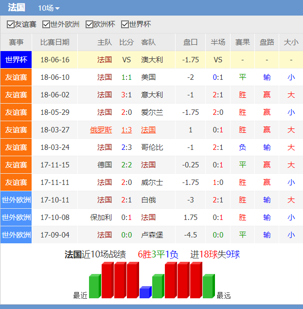 老牌强队法国是2016年欧洲杯亚军,世预赛欧洲区以A组头名力压瑞典荷兰晋级世界杯,菠菜机构开了出线赔率第1,夺冠赔率第4,2.法国中前场拥有格里兹曼、博格巴、姆巴佩、登贝莱和吉鲁等均进攻好手,其中格里兹曼和吉鲁打进了球队世预赛近一半的进球。法国年轻颇具活力,从法国近期热身赛来看,乌姆蒂蒂、坎特、格里兹曼结合已经成型,世界杯前的3场热身赛2胜1平,包括3比1击败传统强队意大利,法国在上个月23号就开始世界杯集训工作,是世界杯最早开始备战的球队之一,球队有备而来。
