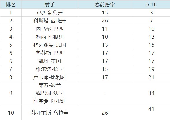 葡萄牙当家核心C罗在小组赛首战西班牙上演救世主,在终场前用一脚完美的任意球绝平,一举改写了世界杯历史上年龄最长球员的帽子戏法纪录,赛后C罗金靴赔率一路降至1赔3成为热门首选。同样在本场用着出色发挥的西班牙神锋科斯塔以1赔7紧随其后。