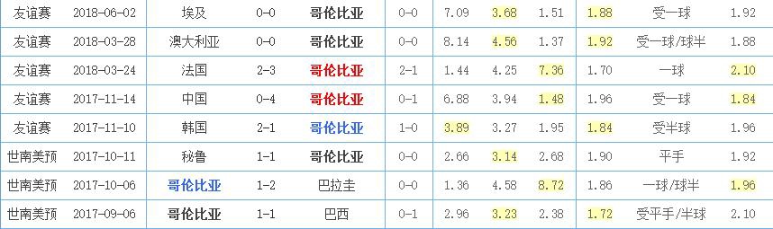哥伦比亚近期战绩没有太亮眼的地方,唯一一点是2-3法国取胜