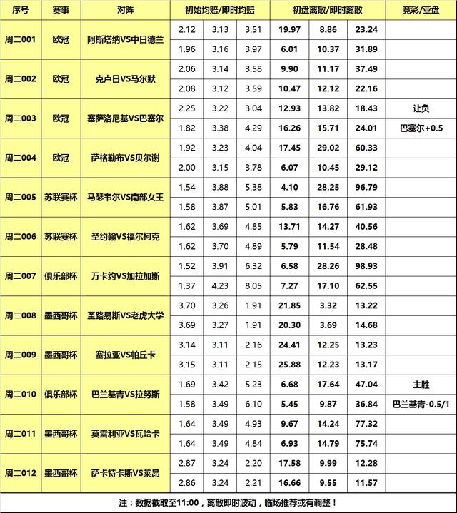 周二足坛赛事丰富,但组合相对混杂。今晚欧冠、苏联杯多场较量,周三早间南俱杯和墨西哥杯赛多场较量。今日竞彩共计开售12场,早盘分享全部12场即时离散,另附欧冠和南俱杯2场早盘解读。