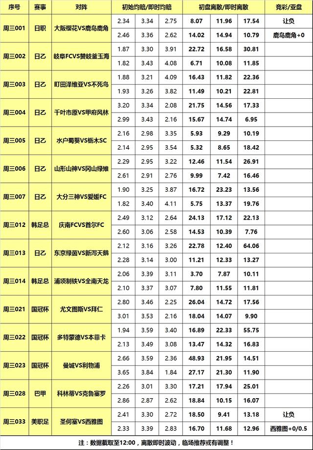 [关于离散] 是竞技彩票特有分析指数,指数基于百家欧赔即时赔率分歧度。基本原理是:百家欧赔平均值与每家赔率差值的绝对值的求和。离散度小则赔率公司观点接近,进而 彩果易打出,离散度大则反之意见分歧大,彩果不易打出。又因庄家操盘/变赔影响,离散低则概率高理论并非放之四海而皆准,需结合盘赔和基本面等信息综合运 用。简言之,离散是参考指标,而非填单依据!以下是各场数据汇总(数据截取至10:00):
