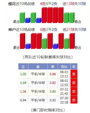 利用总进球率预测法,主队场均进球1.3球,进攻能力很一般,客队场2.1球,场均两球在日本的赛场算的上很不错的成绩,失球数场均也都只有1球,澳门方面一直都是一个平半的盘口,主队水位还不低,可见这个盘口勉强支撑的程度,主队目前排在第五给出平半高水的位置对于大阪樱花并不看好,推荐让负。