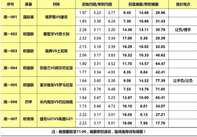 [关于离散] 是竞技彩票特有分析指数,指数基于百家欧赔即时赔率分歧度。基本原理是:百家欧赔平均值与每家赔率差值的绝对值的求和。离散度小则赔率公司观点接近,进而彩果易打出,离散度大则反之意见分歧大,彩果不易打出。受多方因素影响,离散低则概率高理论并非放之四海而皆准,需结合数据和基本面等信息综合运用。简言之离散是参考指标,而非填单依据!以下是各场数据汇总(数据截取至11:00):