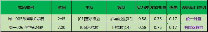 两场比赛一模一样,都是0.58的差距,0.75的盘。查询汇总表的话,这个数据在历史上有7场,全部都分胜负且大分几率很高。但是,今天这两场一个升盘一个降盘,老九始终觉得这个几轮不值得参考。