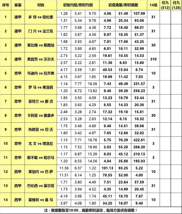 [关于离散] 是竞技彩票特有分析指数,指数基于百家欧赔即时赔率分歧度。基本原理是:百家欧赔平均值与每家赔率差值的绝对值的求和。离散度小则赔率公司观点接近,进而 彩果易打出,离散度大则反之意见分歧大,彩果不易打出。又因庄家操盘/变赔影响,离散低则概率高理论并非放之四海而皆准,需结合盘赔和基本面等信息综合运用。简言之,离散是参考指标,而非填单依据!以下是各场数据汇总(数据截取至11:00):