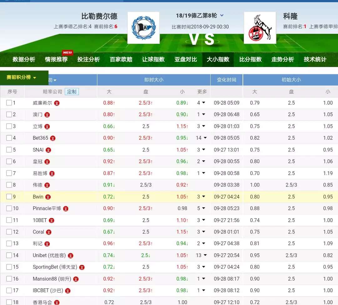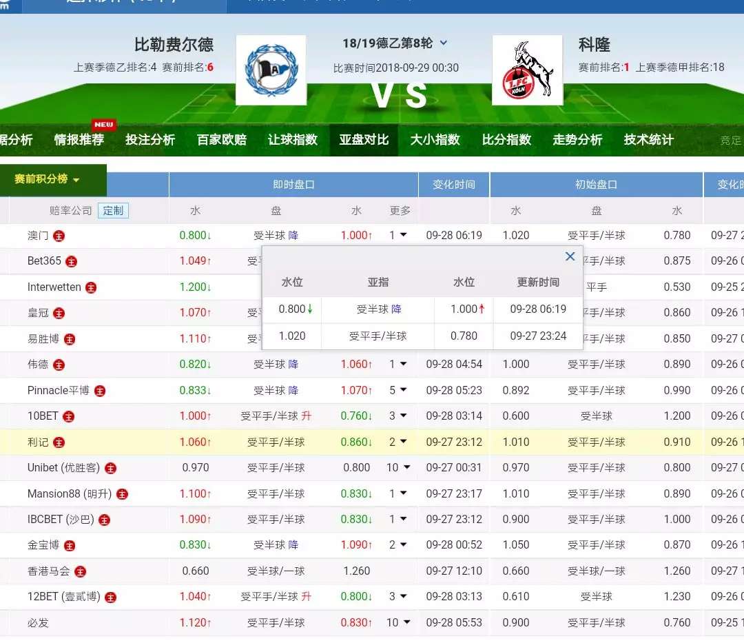 比勒菲尔德与科隆历史交锋主队略优,过去时间相对比较久远,参考价值不大。科隆降班马,很多主力并没有出走,球队目标就是冲甲,本赛季整体状态还算不错,目前排名第一,任何一场比赛战意都会比较强烈,以科隆现在的目标和成绩和现在的状态个人认为这是一个正常的表现,怎么理解呢?打个比方说一下,我们都习惯了拜仁是德甲老大,上赛季海公公没有接手之前拜仁战绩很差,仅仅排名联赛第五欧冠表现也很差,那么我们惯性思维就是拜仁与成绩不符合,那么拜仁最终获得联赛冠军就很容易想到这是正常成绩。那么科隆也是一样,再看比勒菲尔德上赛季第四,具备升级实力,球队也经常参加德甲,本赛季表现也不错,落后科隆四分,战意强烈,本赛季仅仅客场输给汉堡,上轮客场伤停补时连进两球反超战胜上赛季降班马达姆斯塔特士气大振。主队本赛季主场两胜一平,客队客场全胜,我相信投资科隆的玩家不会少,但是本场比赛我们可以通过基本面很容易判断科隆赢球难度非常大。