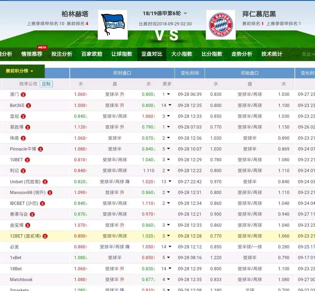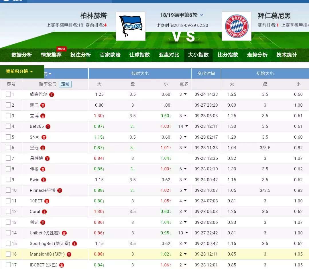 大小球盘口威廉开3.5超高水,澳门开3球低水,我们看拜仁本赛季客场最多就进三球防守能力强,两球居多,客场小球概率高,近期连续三场小球,加上下周中欧冠,本场比赛有一定轮换留力,势必会影响进球效率,柏林本赛季主场成绩不错,虽然近期大球概率高,但是打防守强悍的拜仁势必以防守为主,在这样的形势下,大小球盘口反而开的比较高,个人判断阻大的概率相对较高。综合:拜仁让球半或者球半两球,大小球大3或者大3.5。