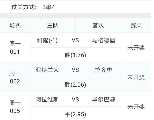 今天比赛比较少,一共5场,大家一定要谨慎下单。再三考虑,选了两场强弱对比分明的比赛组了个2串1,分别是001德乙科隆VS马格德堡和004瓦朗谢纳VS梅斯。