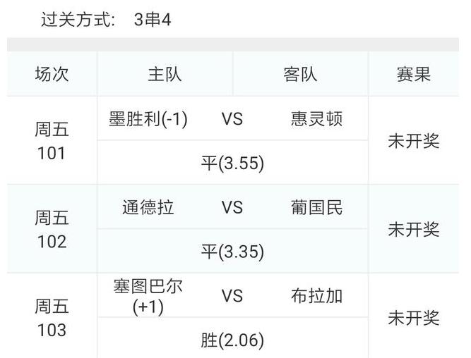 今天有四场比赛,一场澳甲,三场葡联杯。葡联杯的三场比赛中布拉加已经确定小组出线,这样102唐迪拉VS葡萄牙国民和103塞巴图尔VS布拉加这两场比赛就变得不可捉摸。最后选了101墨尔本胜利VS惠灵顿凤凰和104艾维斯VS本菲卡组了一个2串1。