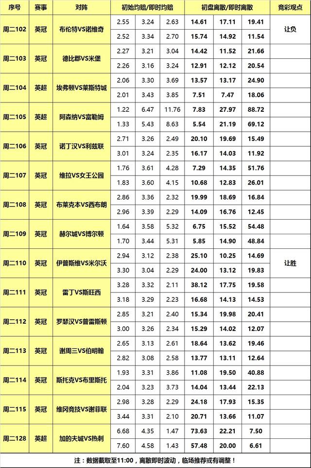 [关于离散] 竞技体育分析指数,也就是各家欧指分歧度。基本原理:百家欧指平均值与每家指数差值的绝对值的求和。离散度小则各家观点接近,进而赛果易打出;离散度大反之意见分歧大,赛果不易打出。又因各方因素影响下指数变动,离散在特殊时刻具有更高参考价值,切勿盲目参考运用。换句话说,离散只是参考指数,而非结论性数据!以下是各场数据汇总(数据截取至11:00):