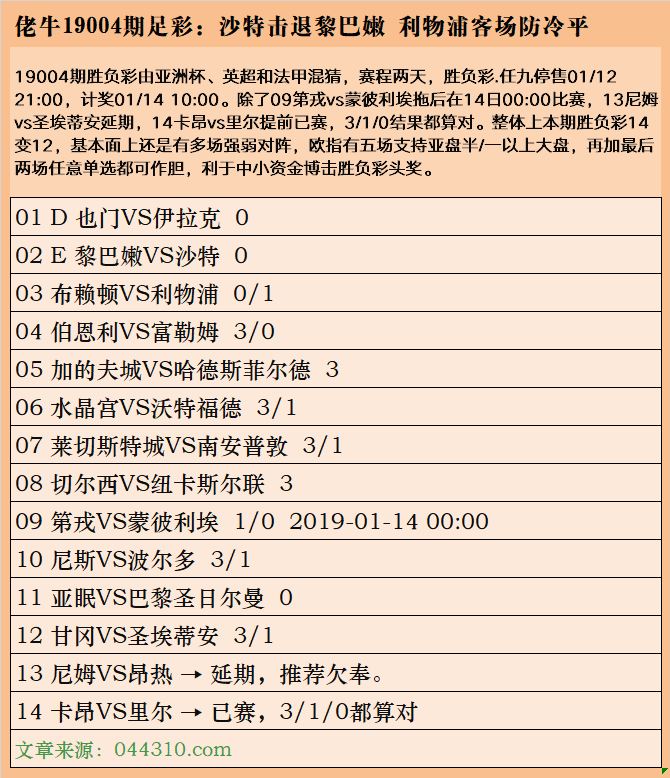 19004期胜负彩由亚洲杯、英超和法甲混猜,赛程两天,胜负彩.任九停售01/12 21:00,计奖01/14 10:00。除了09第戎vs蒙彼利埃拖后在14日00:00比赛,13尼姆vs圣埃蒂安延期,14卡昂vs里尔提前已赛,3/1/0结果都算对。整体上本期胜负彩14变12,基本面上还是有多场强弱对阵,欧指有五场支持亚盘半/一以上大盘,再加最后两场任意单选都可作胆,利于中小资金博击胜负彩头奖。