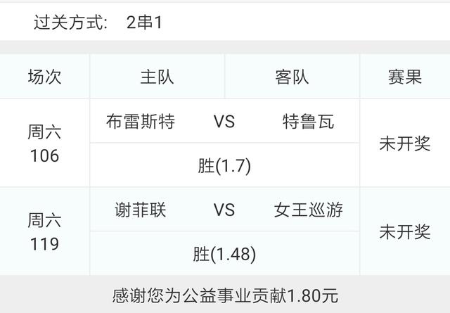 另外2串1选了106布雷斯特VS特鲁瓦和119谢菲联VS女王公园巡游者,这两场比赛主队都是志在升级,客队基本上都算是无欲无求,主胜概率大,过多的分析就不再多说,大家谨慎参考。