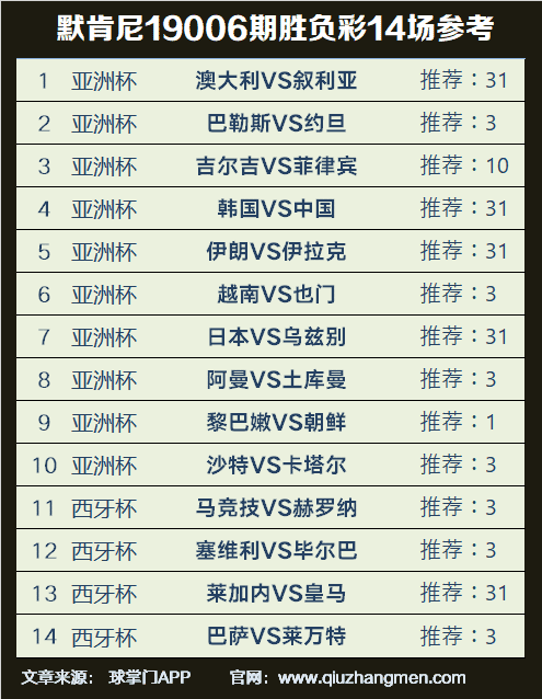 胜负彩19006期重点竞猜亚洲杯小组最后一轮,本期需要留意有的球队已经出线的情况,,本期1月15停售,敬请大家留意。