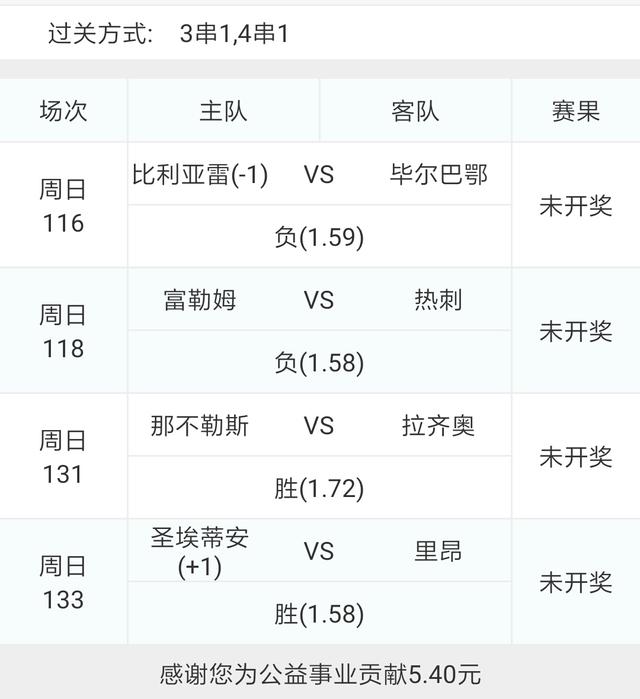 今天的比赛比较多,接受昨天的教训,不再选择博单,选了四场比较稳的比赛,组了一个4串5,大家谨慎参考借鉴!