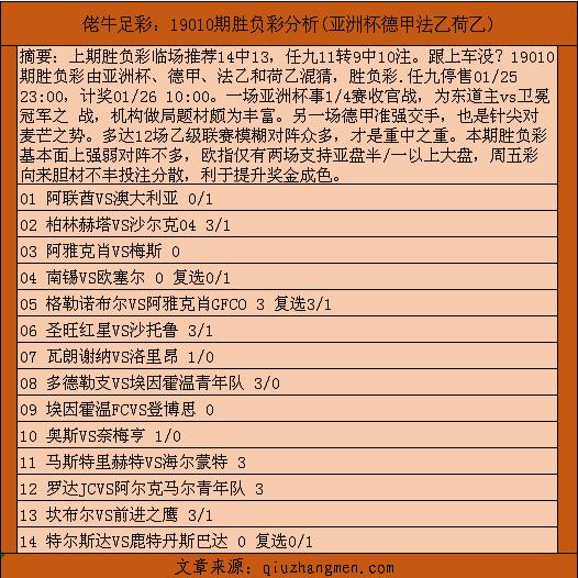 佬牛足彩:19010期胜负彩分析(亚洲杯德甲法乙荷乙)