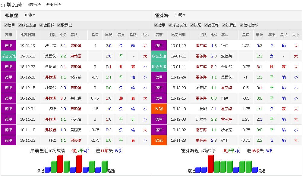 弗赖堡近3次主场面对霍芬海姆取得1胜2和的不败战绩,球员心理佔尽优势,拥有主场之利的弗赖堡值得追捧。竞彩推荐:主让胜