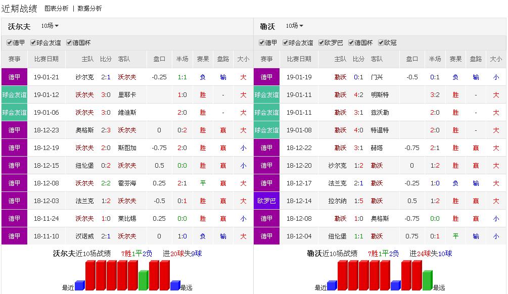中游球队沃尔夫斯堡本赛季18轮联赛积28分暂列第6,比上赛季同期多拿8分。主场拿分效率略逊色于客场,其主场胜率只有33.3%,净胜球为负(-1)。近3个联赛主场2胜1平,包括击败强队莱比锡红牛,主场战力较此前有所提升。上轮客场1-2不敌前半程发挥低迷的沙尔克04,结束6轮不胜(5胜1平)。主帅拉巴迪亚执教生涯13次面对勒沃库森只取得1胜4平8负,不过这唯一一胜却出自本赛季首回合交手。