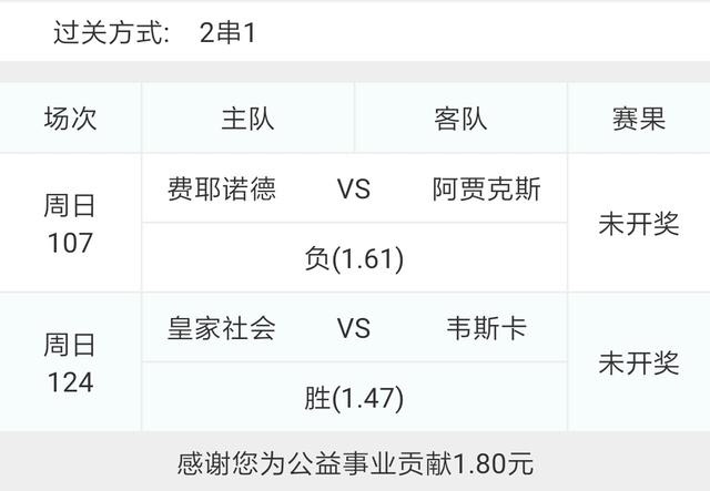首页/ 赛事正文今天的比赛比较多,让人有些挑花了眼。经过仔细分析,2串1选了荷甲107费耶诺德VS阿贾克斯和124西甲皇家社会VS维斯卡两场比赛。