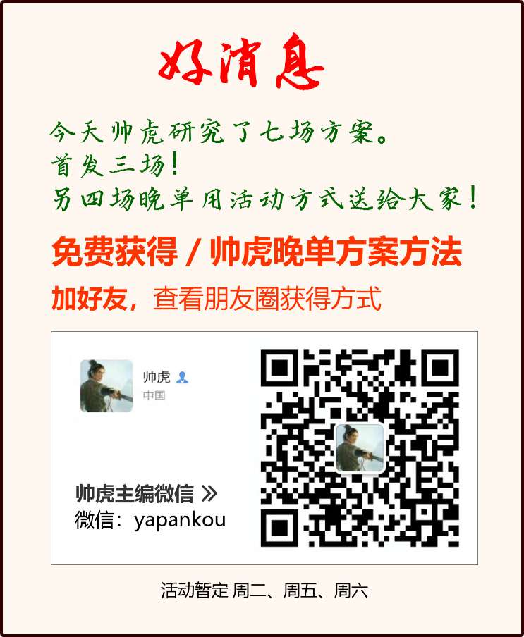 今天总共有七场方案,帅虎首发三场,其它4场晚间通过活动送给大家。