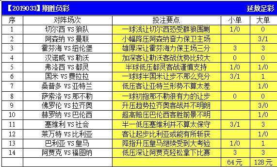19033期胜负彩是英超(2)+德甲(2)+意甲(5)+西甲(4)+荷甲(1)的组合。从亚指数据来看,目前主队为让球方的比赛有6场,6场客队为让球方以及2场平手的场次;其中,指数超过(或等于)半球的比赛有9场,超过(或等于)1球的比赛有7场。