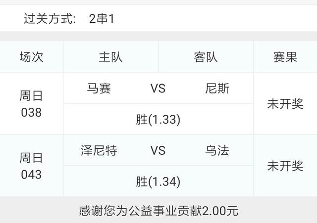 今天的比赛比较多,今天决定不再纠结于赔率,尽量选择比较稳的比赛,选了圣彼得俄超043堡泽尼特VS乌法和038马赛VS尼斯这两场比赛组了一个低赔2串1。