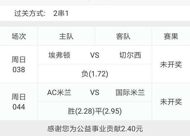 今天的比赛比较多,选了两场强队之间的比赛组了一个2串1分别是038埃弗顿VS切尔西和044米兰德比。
