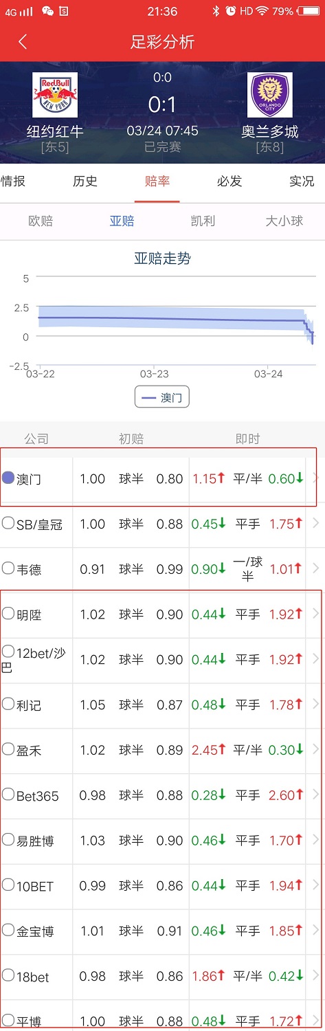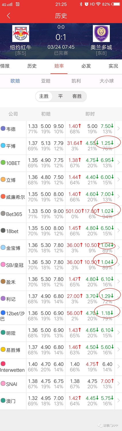由于每天的比赛推荐都是赛事前一天的晚上写好的,所以有时候比赛时间晚的话就没办法复盘,今天早上我一直在关注美职联的红牛对阵奥兰多的比赛,有些朋友肯定会说,你丫水平够菜的啊,这么低的赔率你都推荐错。我承认,我真的水了,不过我回头看临场盘口的时候,我也震惊到了,截图给大家欣赏一下这翻天覆地的变化。