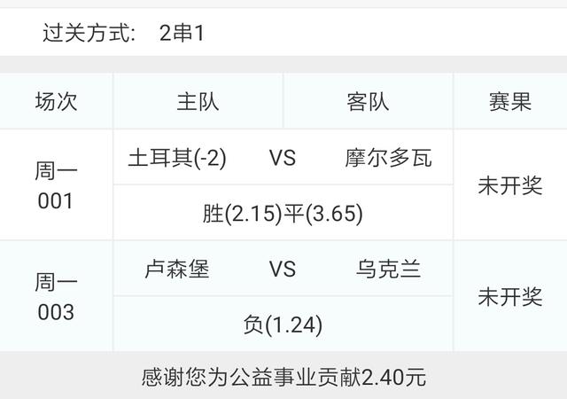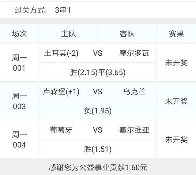 今天的比赛还是欧洲杯为主,选了001土耳其VS摩尔多瓦和003卢森堡VS乌克兰组了一个2串1。