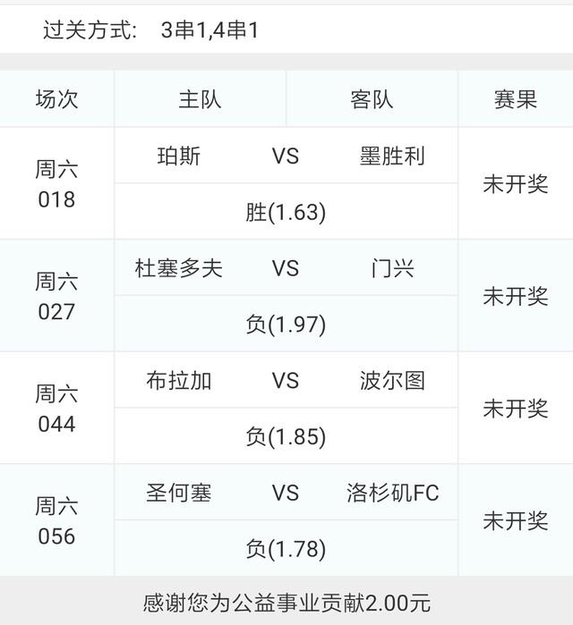 今天的比赛比较多,上午发了几场日职比赛,还没有出结果。晚场比赛还是照例组了一单低赔2串1,一单中赔四串五。