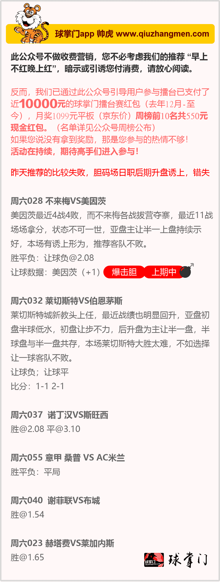 球掌门帅虎 | 竞彩周六6场赛事分析