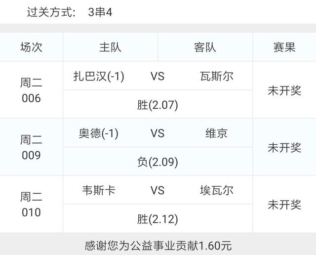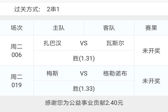 今天的比赛以亚冠和法乙为主,就分别选了一场亚冠和一场法乙组了一个2串1,分别是006亚冠扎巴汉VS瓦斯尔和019法乙梅斯VS圣旺红星。