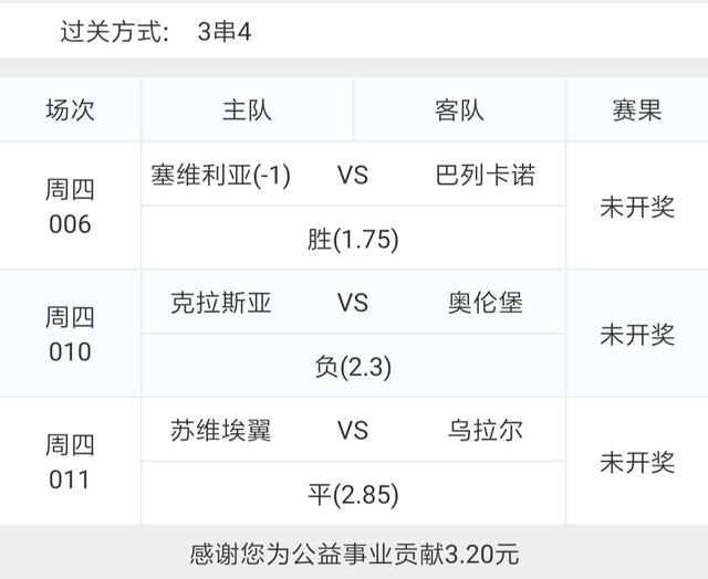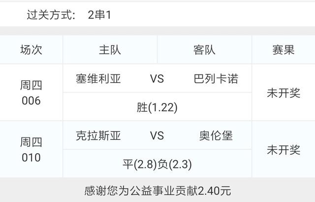 昨天2串1顺利红单,可惜四串十一只红了两场,高赔不易!今天的比赛不多,而且也不太好选,最后思虑再三决定不追求赔率以红单为主,选了006西甲塞维利亚VS巴列卡诺和010俄超叶尼塞VS奥伦堡加索维克这两场比赛。