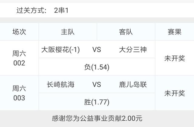 今天有日职联赛,选了002大阪樱花VS大分三神和003长崎成功丸VS鹿儿岛联两场比赛组了一个2串1。日职不好搞,大家谨慎参考,切勿盲目跟单。