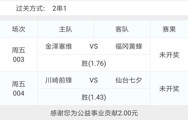 今天有日职比赛,选了003日职乙金泽VS福冈黄蜂和004川崎前锋VS仙台维加泰两场比赛组了一个早场2串1。